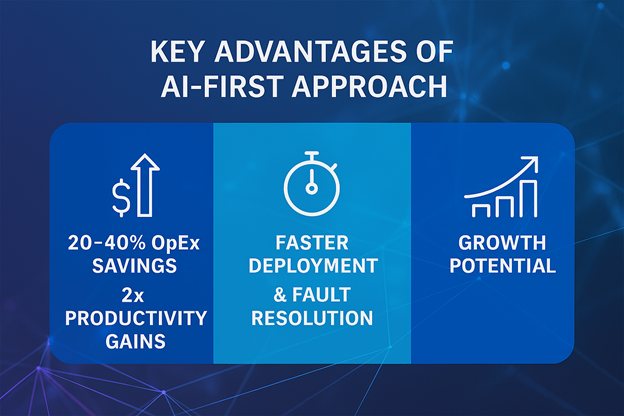 From Cost Efficiency to Growth Acceleration: An AI‑First strategy goes beyond operational optimization—it transforms the network into a strategic growth engine. Industry evidence shows that AI‑driven automation and cloud‑native platforms deliver strong ROI within the first year, with 20–40% OpEx savings, up to 2× productivity gains, and significantly faster service deployment and fault resolution. These efficiencies establish a resilient economic foundation, enabling operators to reinvest savings into high‑growth opportunities such as Network‑as‑a‑Service (NaaS) for on‑demand connectivity, monetizable API ecosystems that unlock partner-led innovation, and AI-at-the-edge services that deliver real‑time intelligence. The network evolves from static infrastructure into a dynamic, monetizable platform that fuels new revenue streams and differentiated customer experiences.