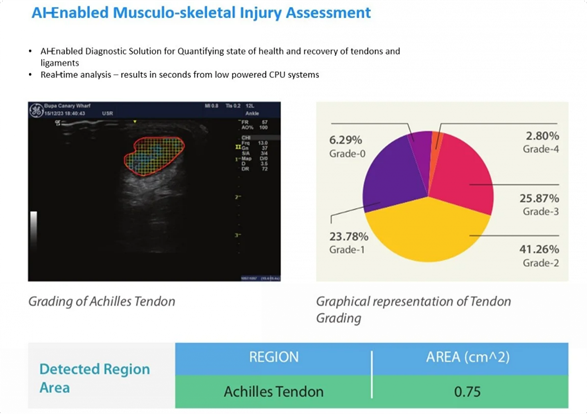 The image shows an AI-enabled system designed to assess musculoskeletal injuries, specifically focusing on the Achilles tendon using ultrasound imaging. The system identifies the tendon region and maps the extent of injury using colour-coded segmentation, where different colours indicate varying levels of damage.